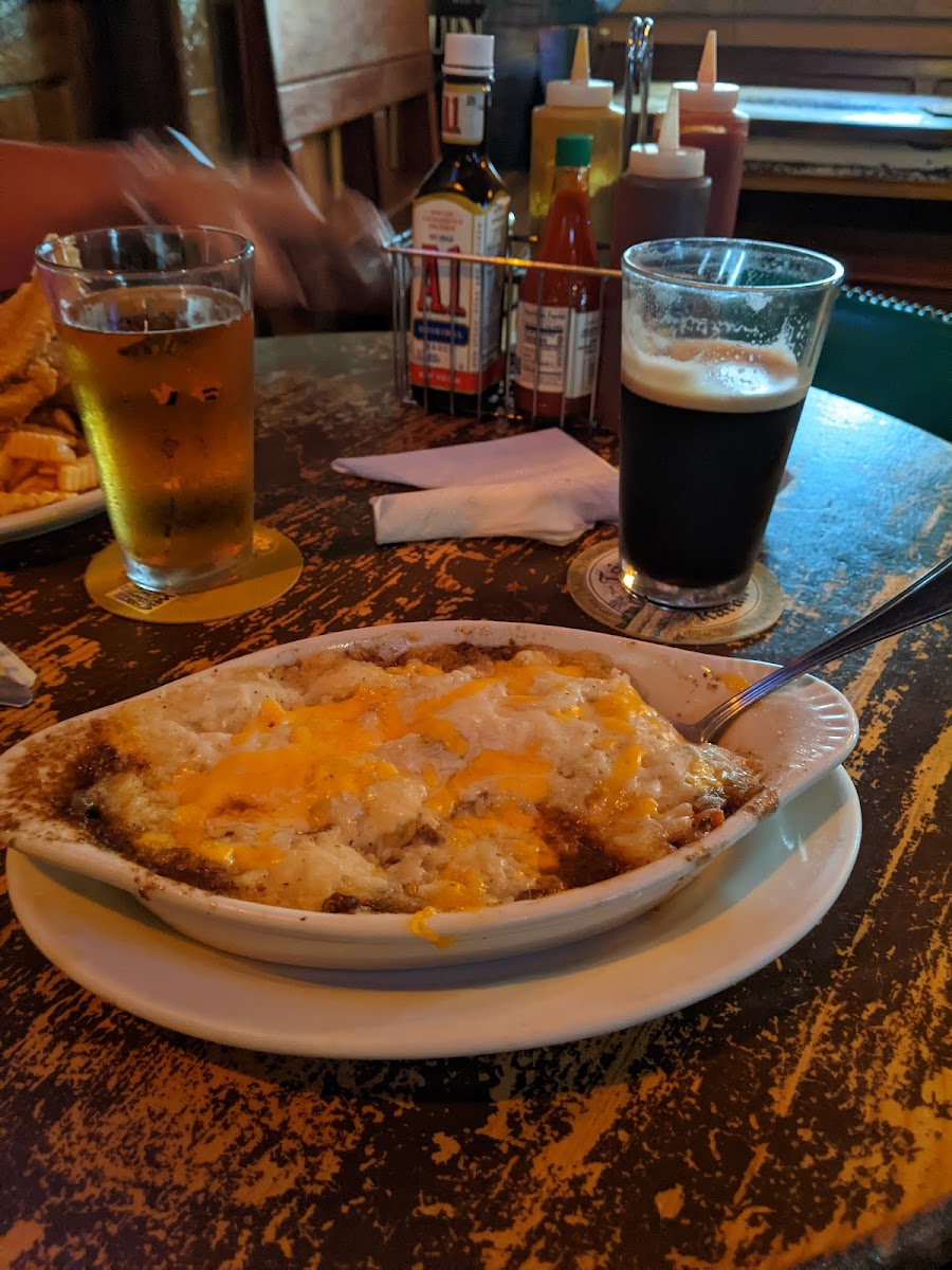 Shepherd's pie is a must get here! The photo is terrible, but the flavor is so good! Cheap drinks for the area as well. Nice outdoor patio/lounge area as well.