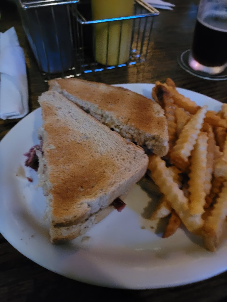 2 inches of Fresh and handmade Reuben sandwich and sauce. Fries were not. Friendly service with Shelvy, Shannon, and Calum. Local pub. Came for the Irish band. Will come again.